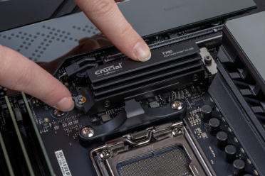 Jason Langiven sitting at a desk and holding up Crucial DRAM to the camera. A T705 and T500 box are placed next to him.